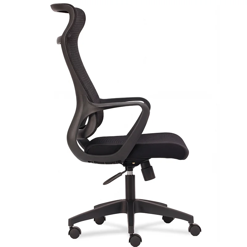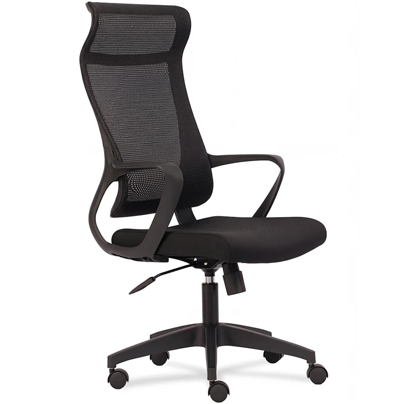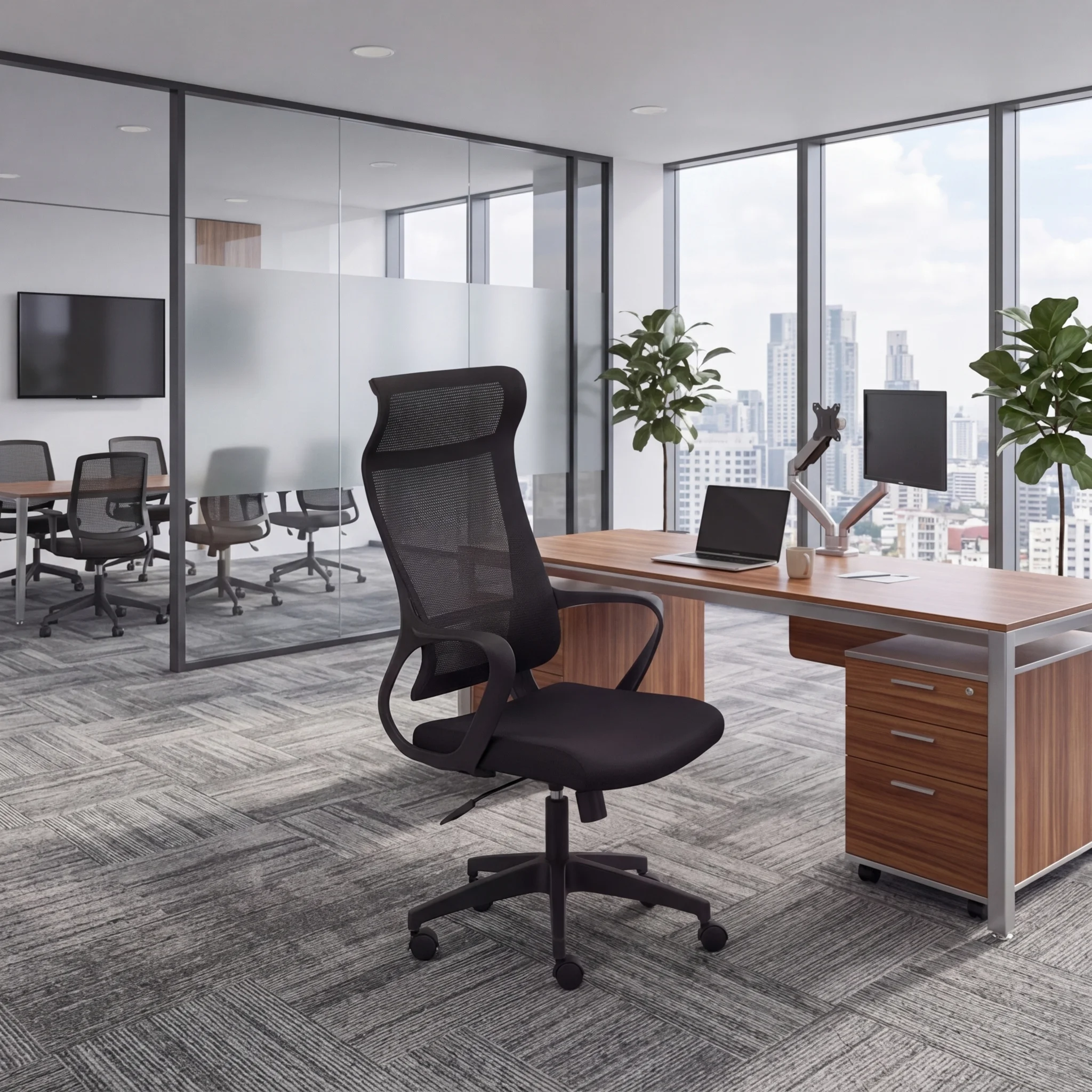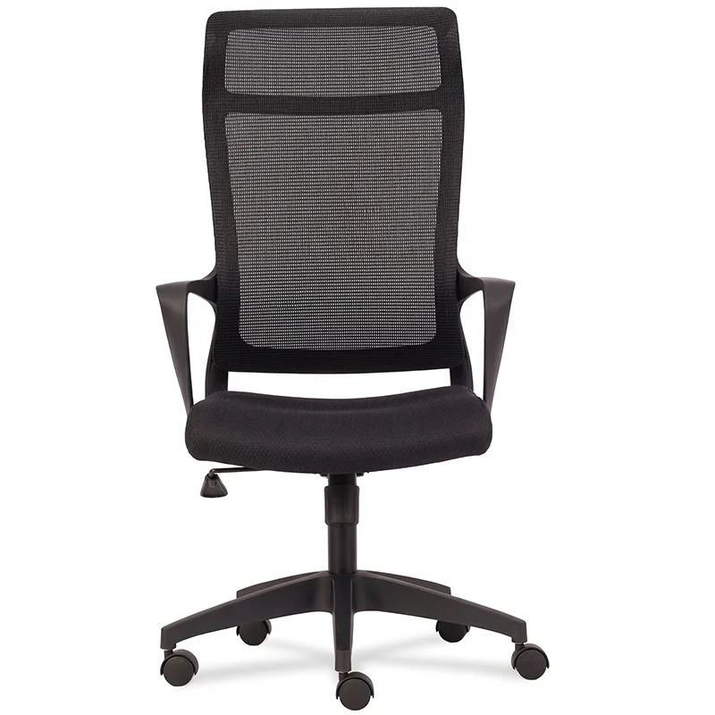 Silla Alzatte con cabecera de malla integrada en un respaldo alto de polipropileno, diseñada con un asiento de espuma estándar de alta densidad tapizado en tela negra. Cuenta con brazos fijos de polipropileno sujetos a la estructura y un mecanismo ejecutivo con bloqueo de reclinamiento certificado por BIFMA para 450,000 ciclos. Su base de nylon gris de 26″ y rodajas de 60 mm aseguran un soporte de peso excepcional y una durabilidad superior, cumpliendo con los más altos estándares de calidad para el entorno profesional.