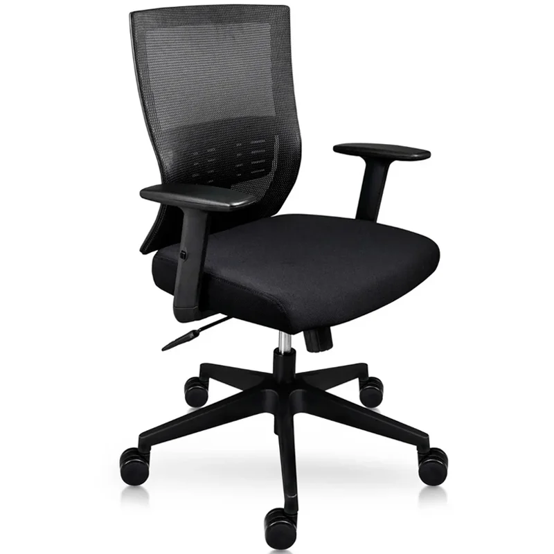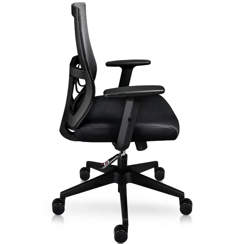 Silla Athenas ergonómica con estructura de polipropileno reforzada con fibra de vidrio en color negro. Presenta un respaldo tapizado en malla y un asiento acojinado con espuma de poliuretano inyectado tapizado en tela color negro, complementado con brazos ajustables en altura con almohadilla suave y certificación BIFMA. Incorpora un mecanismo ejecutivo con bloqueo de reclinamiento de alta durabilidad (450,000 ciclos), pistón clase 3 y una robusta base de nylon de 26″. Todos sus componentes cuentan con certificaciones internacionales que garantizan un soporte de peso excepcional y un desempeño confiable para el uso profesional diario.