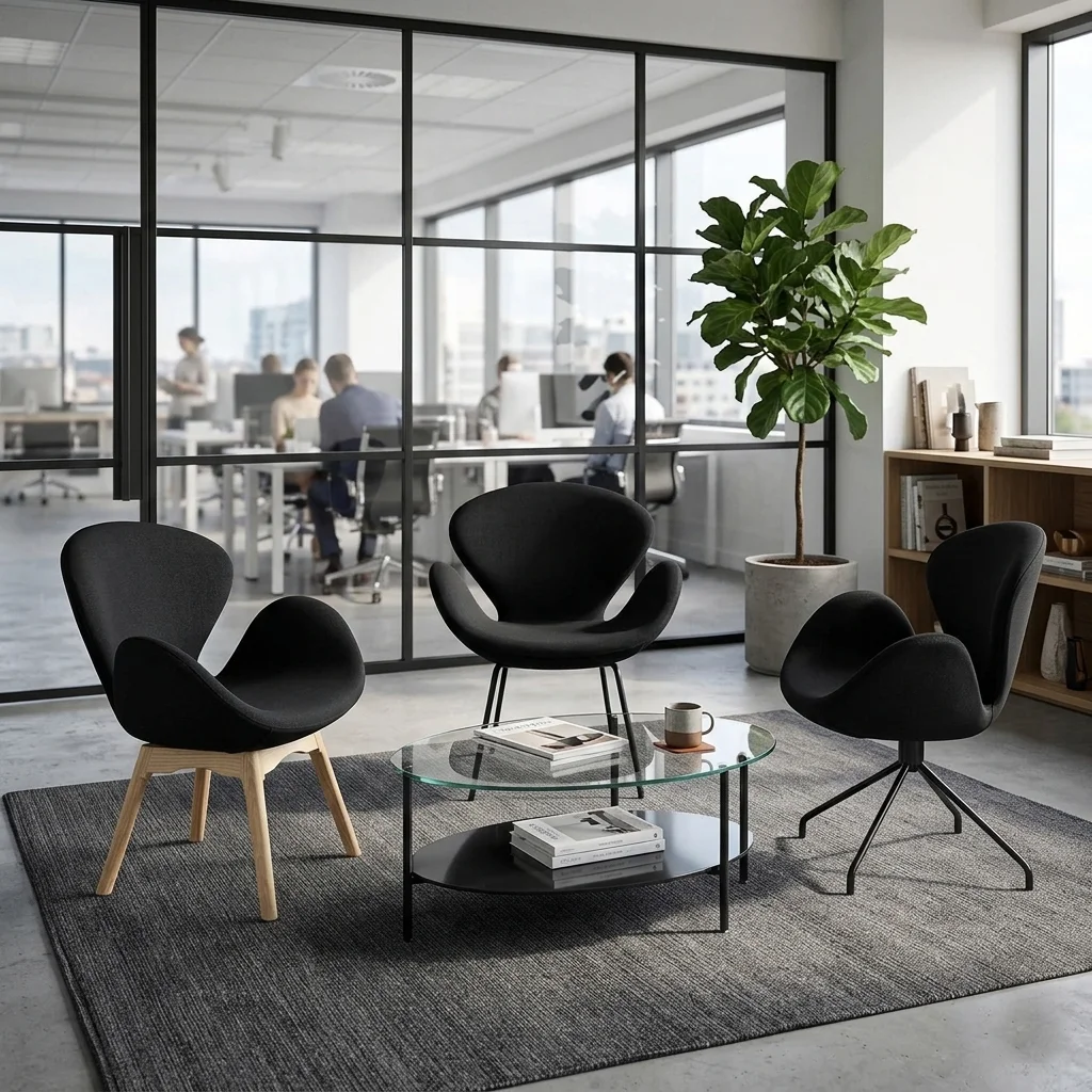 - Respaldo y Asiento: En una sola pieza, con forma ergonómica, interior con plato, espuma de poliuretano inyectado de 35 mm y con soportes de acero, tapizado en tela de alta calidad color negro o gris.